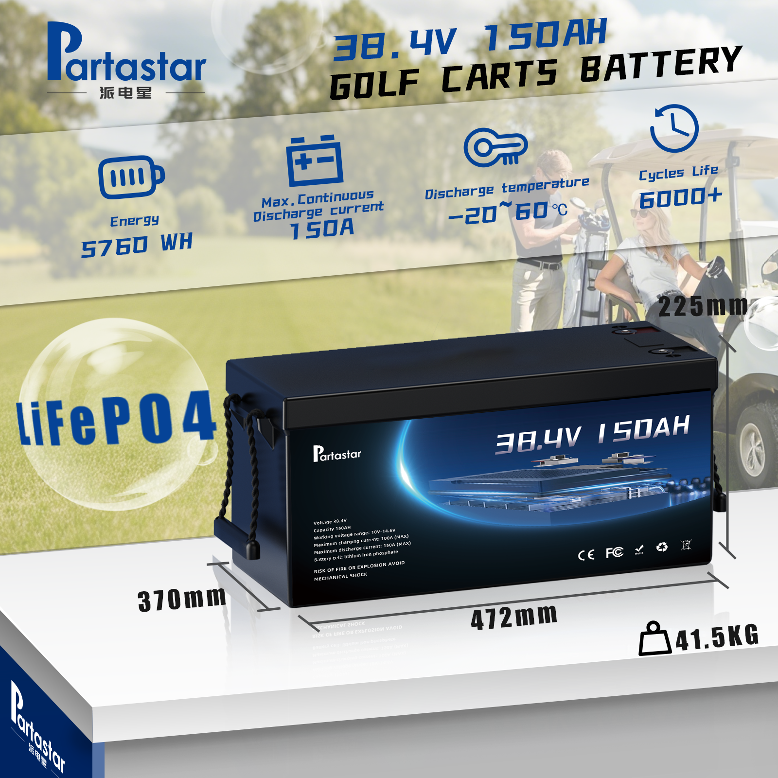 The Partastar 38.4V 150Ah LiFePO4 Battery is engineered for high performance and safety. Featuring lithium iron phosphate cells, it offers a long cycle life, high energy efficiency, and reliable power output. The battery includes multiple protection functions—overcharge protection, over-discharge protection, overcurrent protection, and short-circuit protection—ensuring stable operation and extended service life.