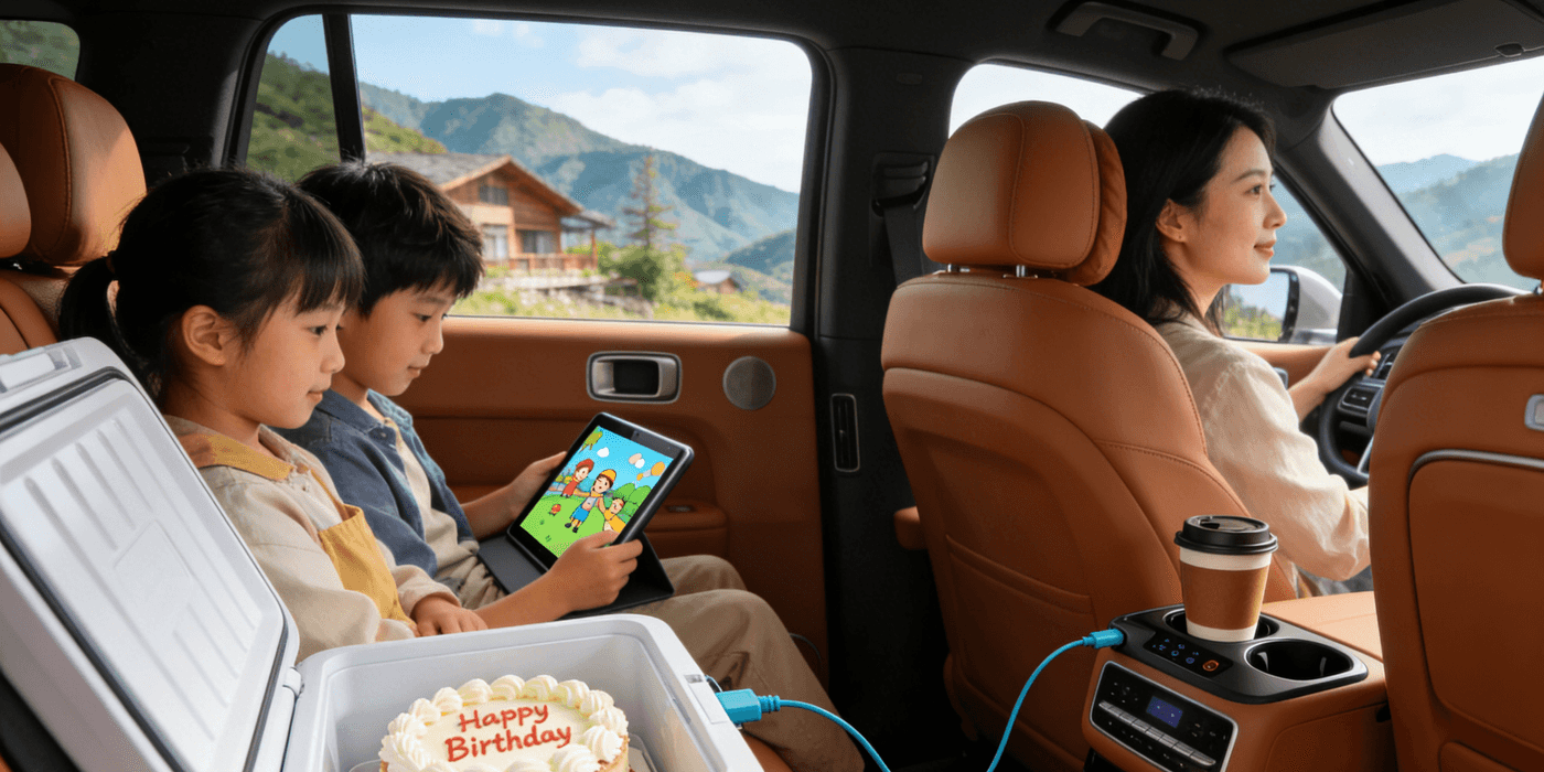 During the day, on the road: A family drives to a mountain homestay. The vehicle-mounted power supply keeps the car refrigerator running, ensuring the birthday cake for friends remains perfectly frosted. Kids watch cartoons on tablets in the backseat, while the heated cup holder keeps mom's coffee warm.
